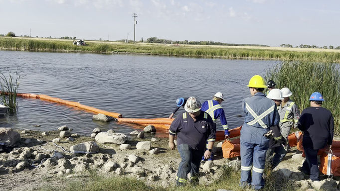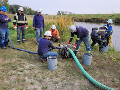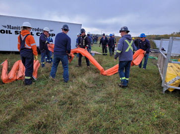In 2024 our spill exercise was held at Coulter Park, Antler River, Two Borders, MB, just south of Melita. This was a moving water exercise. Equipment was deployed near the intersection of the Antler River and one of its tributaries. A line of boom was situated adjacent to the bank receiving the greatest force of the river current. Another line of boom was run across the river to form a 'V' with the shore protecting boom. It was held in place by the anchor points set up on each side of the river, as well as by ropes attached at various points. Once connected with the skimmer and pump, peat moss was introduced at the far reach of the boom, functioning as a simulated oil spill.